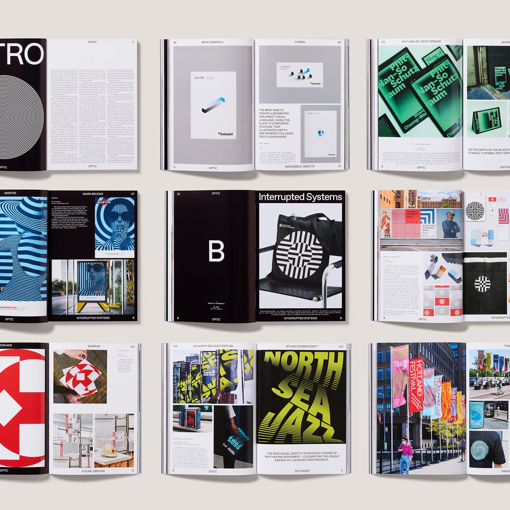 It is the purpose of ‘Optic’ to attempt a survey of optical effects in graphic design and to help distinguish their various forms. As such, the book is split into sections such as: Periodic Structures, Interrupted Systems, Relief, Impossible Objects, Diffusion, Illusory Contours, Figure-ground, Proximity and Isometric Illusion.