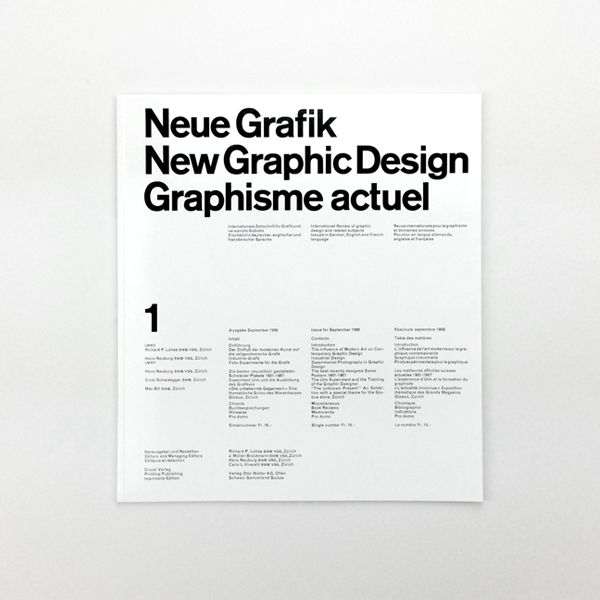 From a historical point of view, Neue Grafik can be seen as a programmatic platform and effective publishing organ of Swiss graphic design, an international authority in its field at the time. Protagonists of the Swiss school and its rigorous Zurich fraction lead an essential discourse on the foundations of current communication and constructive design. The influence of this movement cannot be overstated. The Swiss school, also called 'International Style', became exemplary for the conceptual approach to corporate design of increasingly globally operating corporations and an influential precursor in the design of individual projects, such as posters, exhibitions, and publications.